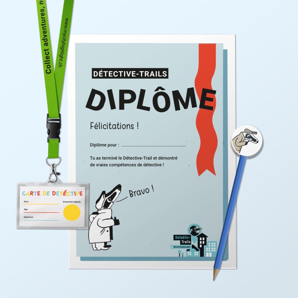 - 1 diplôme de détective personnalisable, à remettre aux enfants après avoir terminé le trail.