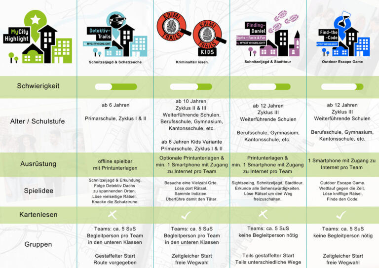 Que ce soit un Crime-Trail, un Finding-Daniel ou un Find-the-Code (actuellement uniquement en allemand) : nous avons l’aventure idéale pour chaque classe et chaque tranche d’âge en Suisse ! Une vue d’ensemble complète de tous nos produits est disponible dans notre document d’information pour les enseignants.