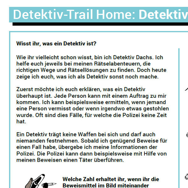 Den Detektiv-Trail Home erhältst du nach dem Kauf per PDF zum selber ausdrucken. Das PDF enthält folgende Elemente: